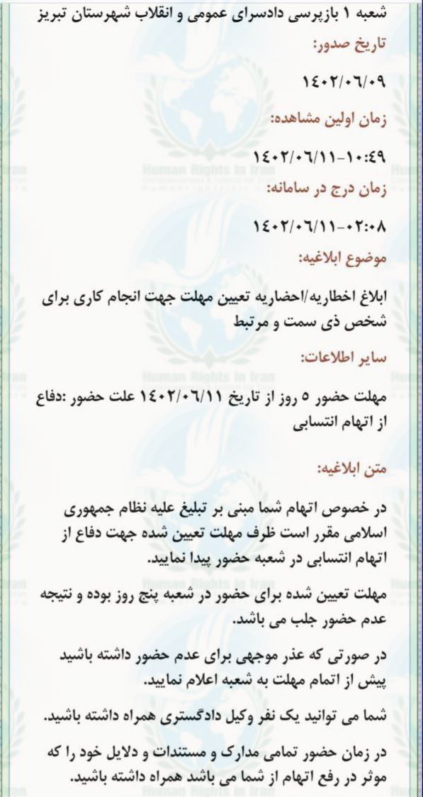 حقوق بشر در ایران ـ امروز شنبه ۱۱شهریور ماه ۱۴۰۲، آرمیتا پاویر، با دریافت ۲ ابلاغیه کتبی به شعبه بازپرسی در دادسرای شهر تبریز، احضار شد.