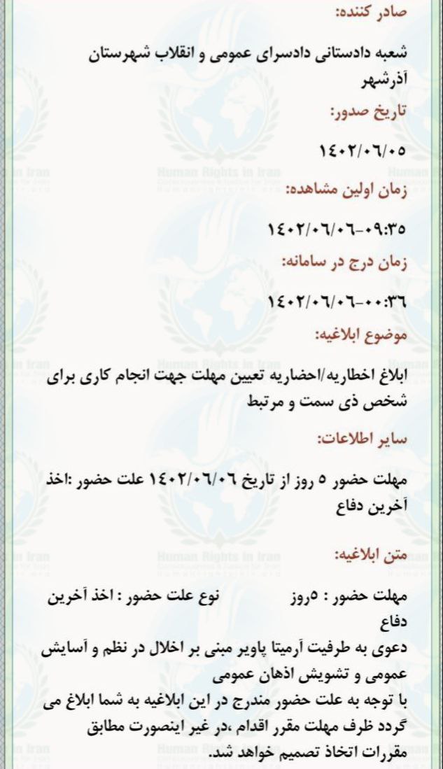 حقوق بشر در ایران ـ امروز شنبه ۱۱شهریور ماه ۱۴۰۲، آرمیتا پاویر، با دریافت ۲ ابلاغیه کتبی به شعبه بازپرسی در دادسرای شهر تبریز، احضار شد.