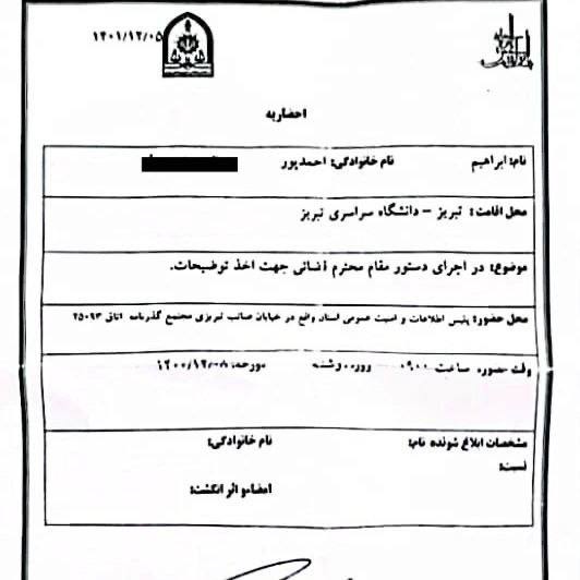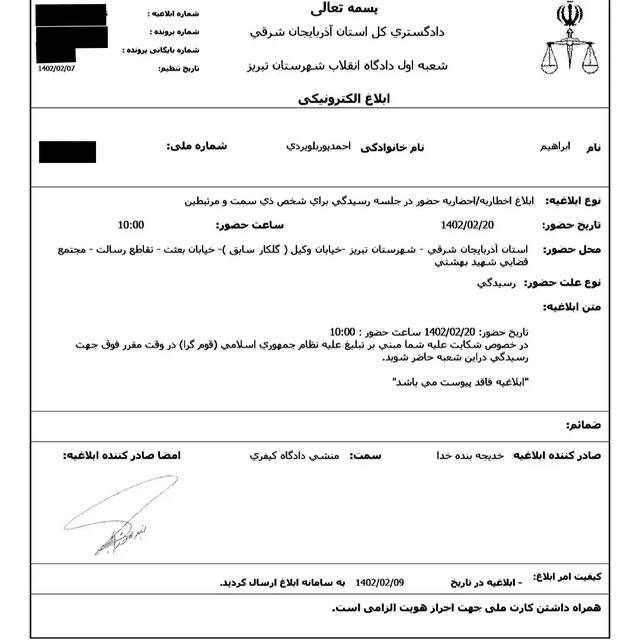 براساس ابلاغیه صادره توسط رئیس دفتر شعبه اول دادگاه انقلاب تبریز که از طریق سامانه ابلاغ الکترونیکی ثنا، برای ابراهیم احمدپور ارسال گردیده اتهام وی(تبلیغ علیه نظام جمهوری اسلامی ـ قوم گرا)، عنوان و این شهروند باید جهت ارائه دفاعیات خود در تاریخ مذکور به شعبه اول دادگاه انقلاب تبریز مراجعه کند.
