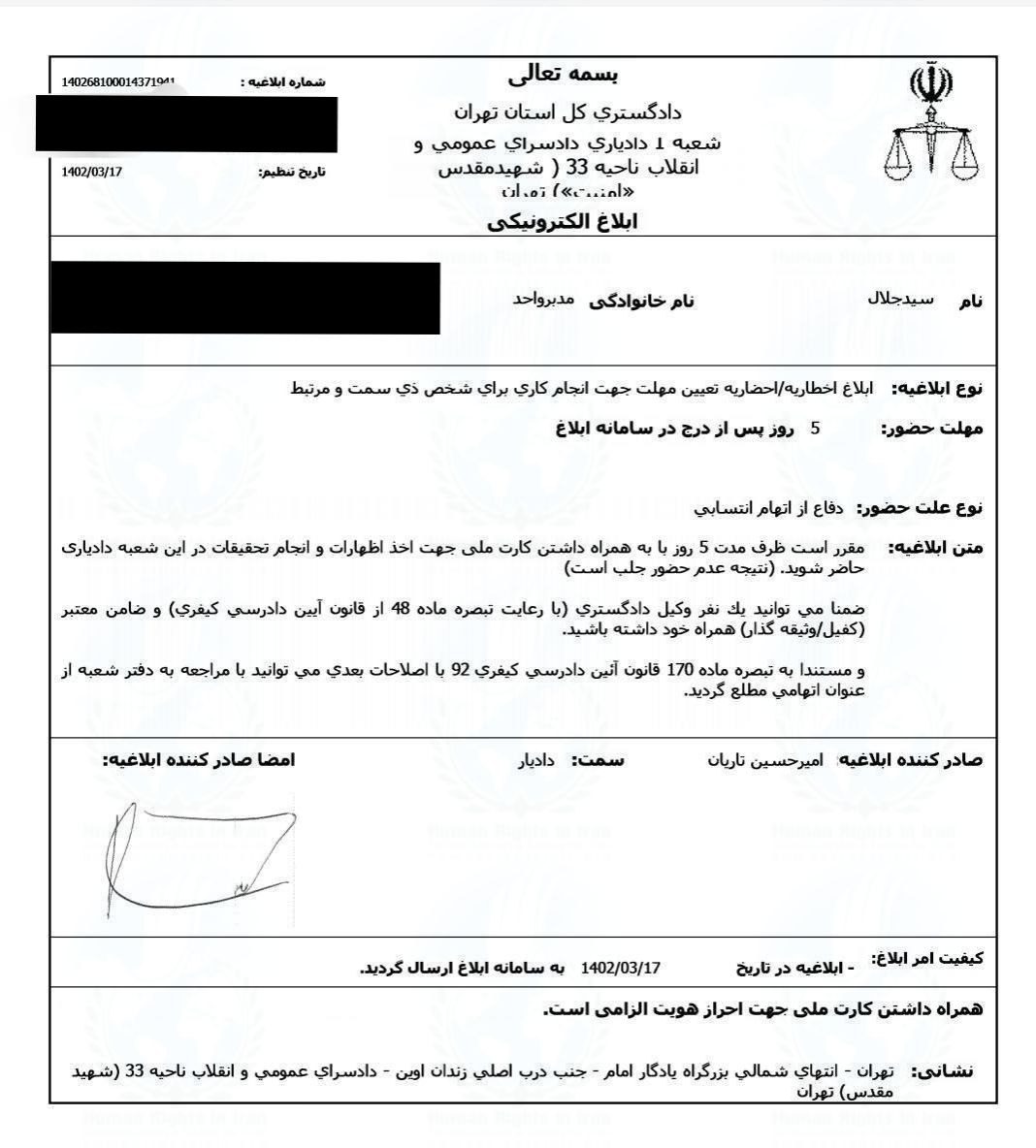 براساس ابلاغیه کتبی که در تاریخ ۱۷ خرداد ماه ۱۴۰۲، توسط بازپرس امیرحسین تاریان، صادر و از طریق سامانه ابلاغ الکترونیک قوه قضائیه (ثنا) برای این فعال سیاسی ارسال گردیده مقر شده تا سیدجلال مدبر واحد، ظرف مدت ۵ روز از تاریخ ابلاغ (جهت اخذ اظهارات و انجام تحقیقات) به شعبه ۱ دادیاری واقع در دادسرای ناحیه ۳۳ (امنیت) تهران، مراجعه کند.