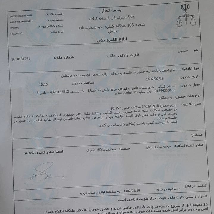 حقوق بشر در ایران ـ امروز دوشنبه ۱۸ اردیبهشت ماه ۱۴۰۲، حسین ملکی، برای محاکمه به شعبه ۱۰۳ دادگاه کیفری ۲ شهرستان تالش از توابع استان گیلان احضار شد.