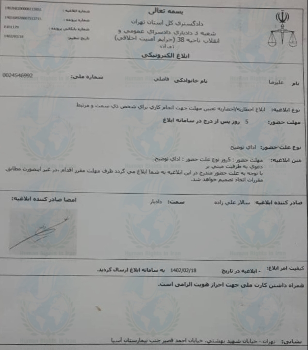 حقوق بشر در ایران – امروز چهارشنبه ۲۰ اردیبهشت ماه ۱۴۰۲، شعبه ۳ بازپرسی دادسرای ناحیه ۳۸ تهران با ارسال ابلاغیه ای کتبی، علیرضا فاضلی را احضار کرد.
