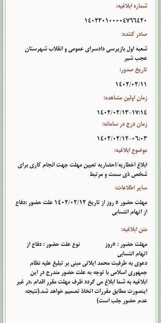 حقوق بشر در ایران ـ امروز جمعه ۱۵ اردیبهشت ماه ۱۴۰۲، شعبه اول بازپرسی دادسرای شهرستان عجب شیر با ارسال ابلاغیه ای کتبی، محمد ایلاتی را احضار کرد.