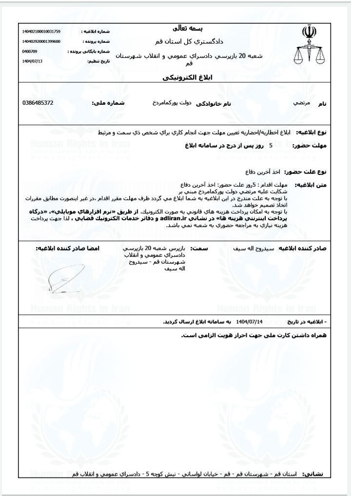 حقوق بشر در ایران ـ امروز سه شنبه ۱۳آبان ماه ۱۴۰۴، مرتضی دولت پور کمامردخ، در مرحله بازپرسی تفهیم اتهام شده است.