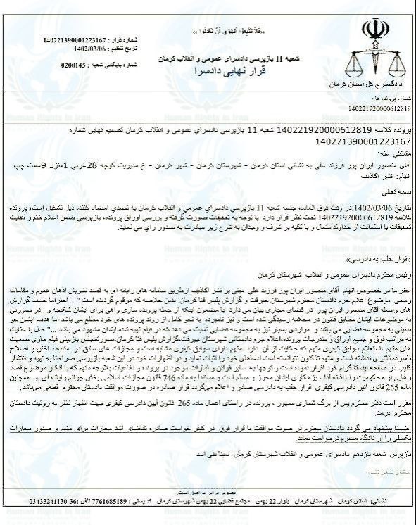 لازم به اشاره است، منصور ایران پور، مدتی قبل با حضور در شعبه ۱۱ بازپرسی دادسرای عمومی و انقلاب استان کرمان، و ارائه دفاعیات خود به سینا بنی اسد، بازپرس شعبه مذکور، در تاریخ ۶ خرداد ماه ۱۴۰۲، قرار مجرمیت (کیفرخواست) خود را دریافت کرده بود.