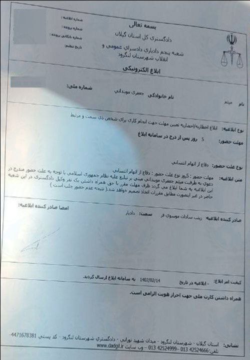 حقوق بشر در ایران ـ امروز دوشنبه ۱۸ اردیبهشت ماه ۱۴۰۲، زینب موسوی فر، دادیار شعبه ۵ دادسرای عمومی و انقلاب شهرستان لنگرود، میثم جعفری را جهت تفهیم اتهام، احضار کرد.