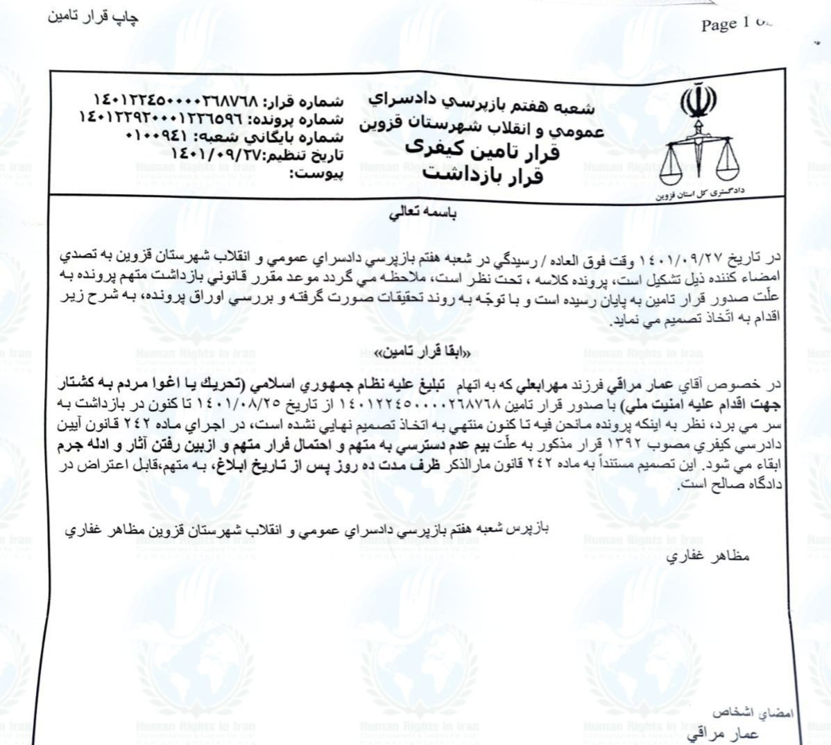 لازم به اشاره است، عمار مراقی، پیش از این هم در تاریخ ۲۵ آبان ماه ۱۴۰۱، در پی یورش ماموران اداره اطلاعات استان قزوین، به منزل پدری وی بازداشت و پس از تفتیش و توقیف برخی لوازم شخصی از قبیل گوشی تلفن همراه، سپس به بازداشتگاه اداره اطلاعات در آن استان منتقل شد و با توجه به گذشت ۲۰ روز از زمان بازداشت و تداوم بازجویی ها در سلول انفرادی محبوس و پس از اتمام بازجویی ها به بند ۱۵ زندانیان سیاسی در زندان چوبیندر(مرکزی) استان قزوین۷ منتقل شد.