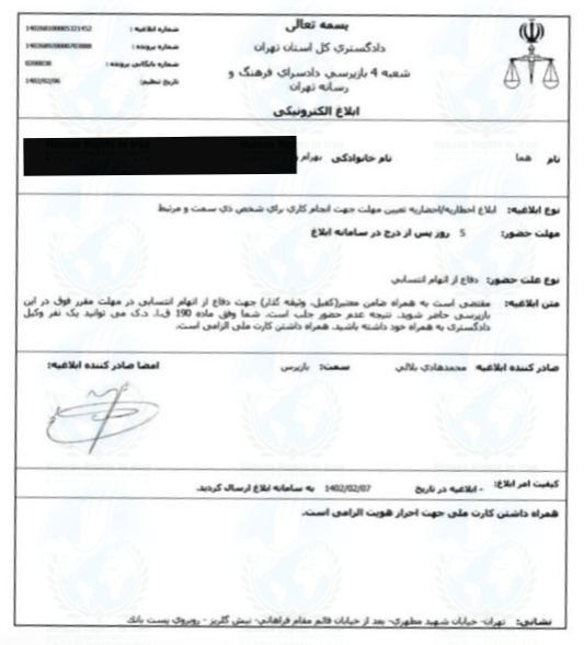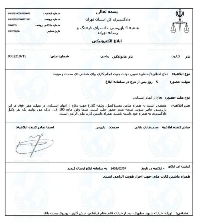 حقوق بشر در ایران ـ امروز شنبه ۱۶ اردیبهشت ماه ۱۴۰۲، رئیس دفتر شعبه ۴ دادسرای فرهنگ و رسانه تهران با ارسال ابلاغیه های کتبی، کتایون ریاحی و پانته (هما) بهرام را احضار کرد.