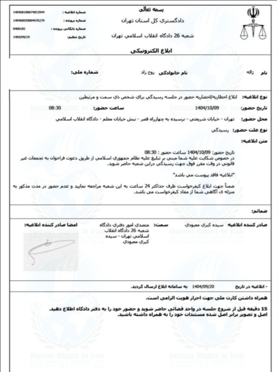براساس ایلاغیه صادره در تاریخ ۱۹ آذر ماه ۱۴۰۴، مقرر شده تا ژاله روحزاد، برای دفاع از خود در برابر اتهام «فعالیت تبلیغی علیه نظام از طریق دعوت و انتشار فراخوان به تجمعات غیرقانونی» به قاضی ایمان افشاری ـ رئیس شعبه ۲۶ دادگاه انقلاب تهران، در آن جلسه دادرسی حاضر شود.