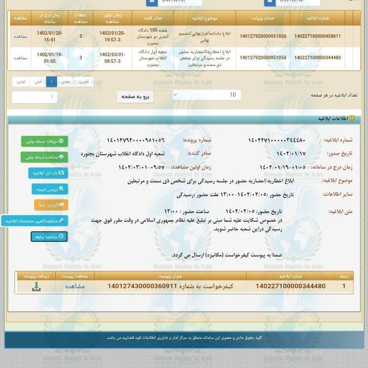 به نقل از یک منبع مطلع در گفتگو با گزارشگر حقوق بشر در ایران:”ابتدا در تاریخ ۱ خرداد ماه ۱۴۲ پیامکی برای آقای یداللهی بابت ارجاع پرونده وی به شعبه ۱۰۵ دادگاه کیفری ۲ بجنورد ارسال شد و این در حالی بود که وی پیشتر در همین پرونده محاکمه و به پرداخت جریمه نقدی محکوم شده بود ولی پس از مراجعه به حساب کاربری خود در سامانه ابلاغ (ثنا) متوجه شد که براساس ابلاغیه ای که از تاریخ ۱۷ فروردین ماه ۱۴۰۲ در ثنا ثبت شده بود از این فعال مدنی خواسته شده بود برای تاریخ رسیدگی ۵ اردیبهشت ماه ۱۴۰۲، به شعبه اول دادگاه انقلاب بجنورد برای ارائه دفاع از بابت اتهام (فعالیت تبلیغی علیه نظام) احضار شده بود اما هیچگونه پیامکی مبنی بر درج ابلاغ در سامانه برای اطلاع و مراجعه وی به حساب کاربری اش به او ارسال نشده است.”
