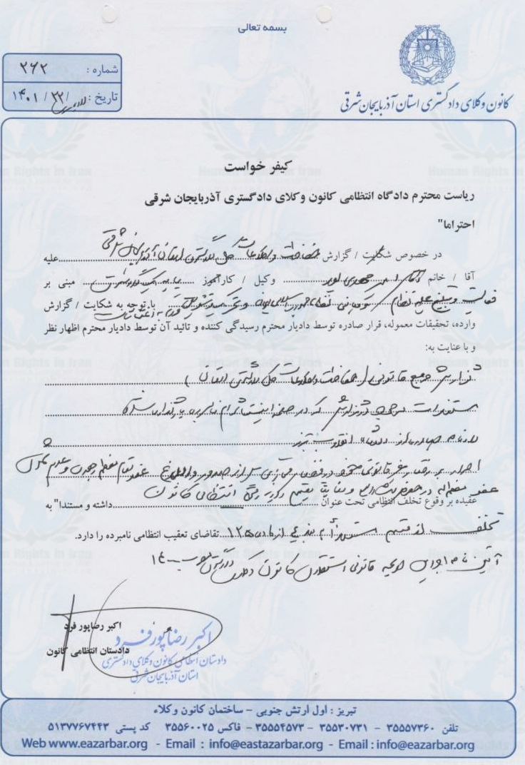 حقوق بشر در ایران ـ امروز شنبه ۳ تیر ماه ۱۴۰۲، دادگاه انتظامی کانون وکلای دادگستری استان آذربایجان شرقی با تنظیم کیفرخواستی، امیر مهدی پور را احضار کرد.