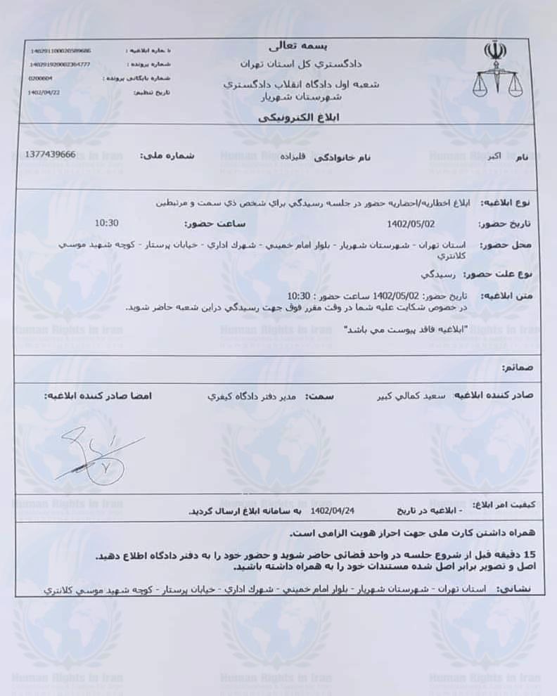 حقوق بشر در ایران ـ امروز دوشنبه ۲ مرداد ماه ۱۴۰۲، اکبر قلیزاده(یاشارتبریزی)، فعال مدنی برای محاکمه به شعبه ۱ دادگاه انقلاب شهرستان شهریار احضار شد.