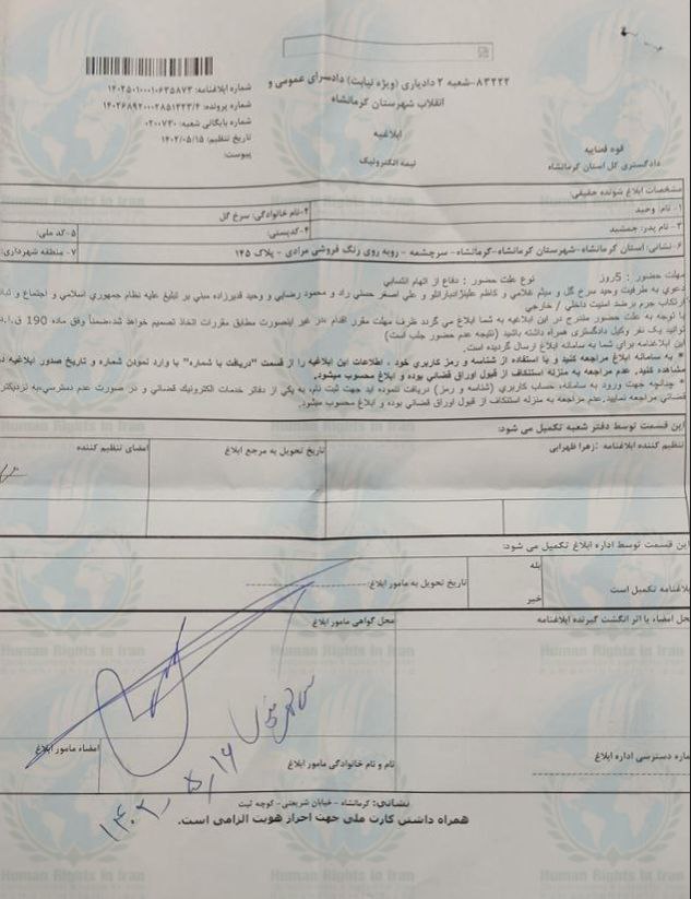 لازم به اشاره است، طی روزهای اخیر، وحید سرخ گل، برای بازپرسی و تفهیم اتهامات(تبلیغ علیه نظام) و (اجتماع و تبانی) به شعبه ۳ دادسرای انقلاب استان کرمانشاه احضار شده بود.