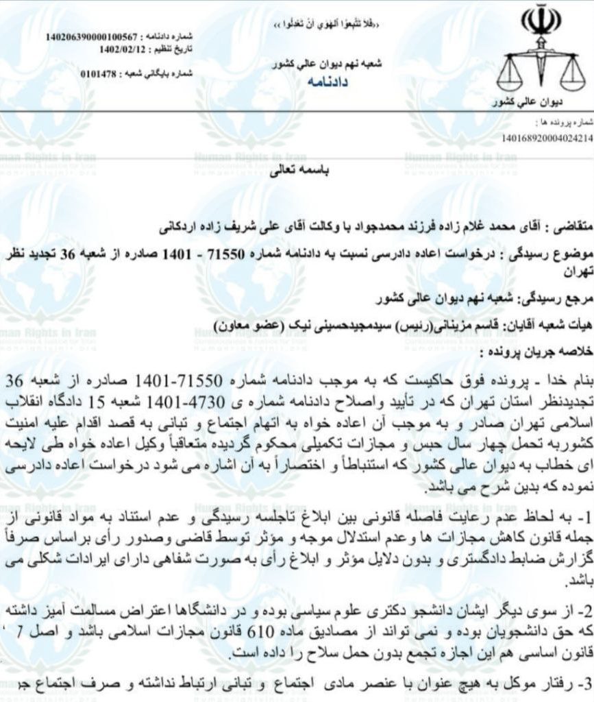 به گزارش حقوق بشر در ایران، روز سه شنبه ۱۲ اردیبهشت ماه ۱۴۰۲، درخواست اعاده دادرسی محمد غلام زاده (آبتین بهرنگ)، دانشجوی مقطع دکترا در رشته جامعه شناسی دانشگاه تهران و از بازداشت شدگان اعتراضات سراسری ۱۴۰۱، توسط قضات شعبه ۹ دیوان عالی کشور پذیرفته و پرونده وی به شعبه هم عرض در دادگاه انقلاب تهران ارجاع شد. این دانشجوی دانشگاه تهران، در جریان اعتراضات ۱۴۰۱، بازداشت و پس از مدتی در راستای اعمل بخشنامه قوه قضائیه آزاد شد. وی پیشتر هم توسط شعبه ۱۵ دادگاه انقلاب تهران به ریاست ابوالقاسم صلواتی به ۵ سال حبس تعزیری و مجازات تکمیلی محکوم شده بود.