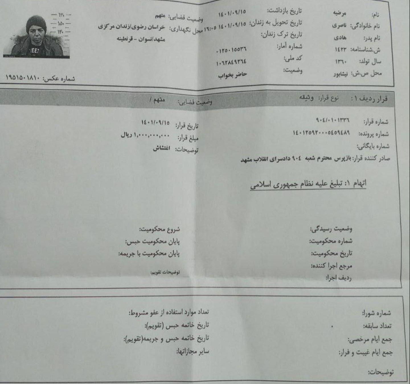 حقوق بشر در ایران ـ امروز چهارشنبه ۲۳ فروردین ماه ۱۴۰۲، سارا ناصری، از بازداشت شدگان مرتبط با اعتراضات سراسری بطور بلاتکلیف در زندان وکیل آباد مشهد بسر می برد.