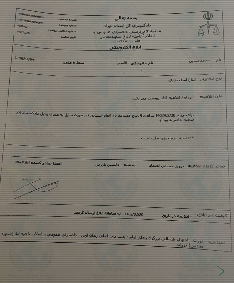 به گزارش حقوق بشر در ایران، روز چهارشنبه ۲۰ اردیبهشت ماه ۱۴۰۲، محمدحسین آقاسی، وکیل پایه یک دادگستری، ساکن تهران، با دریافت ابلاغیه ای کتبی جهت تفهیم اتهام به شعبه ۷ بازپرسی دادسرای ناحیه ۳۳ تهران به ریاست بهروز حسنی اعتماد، احضار شد.