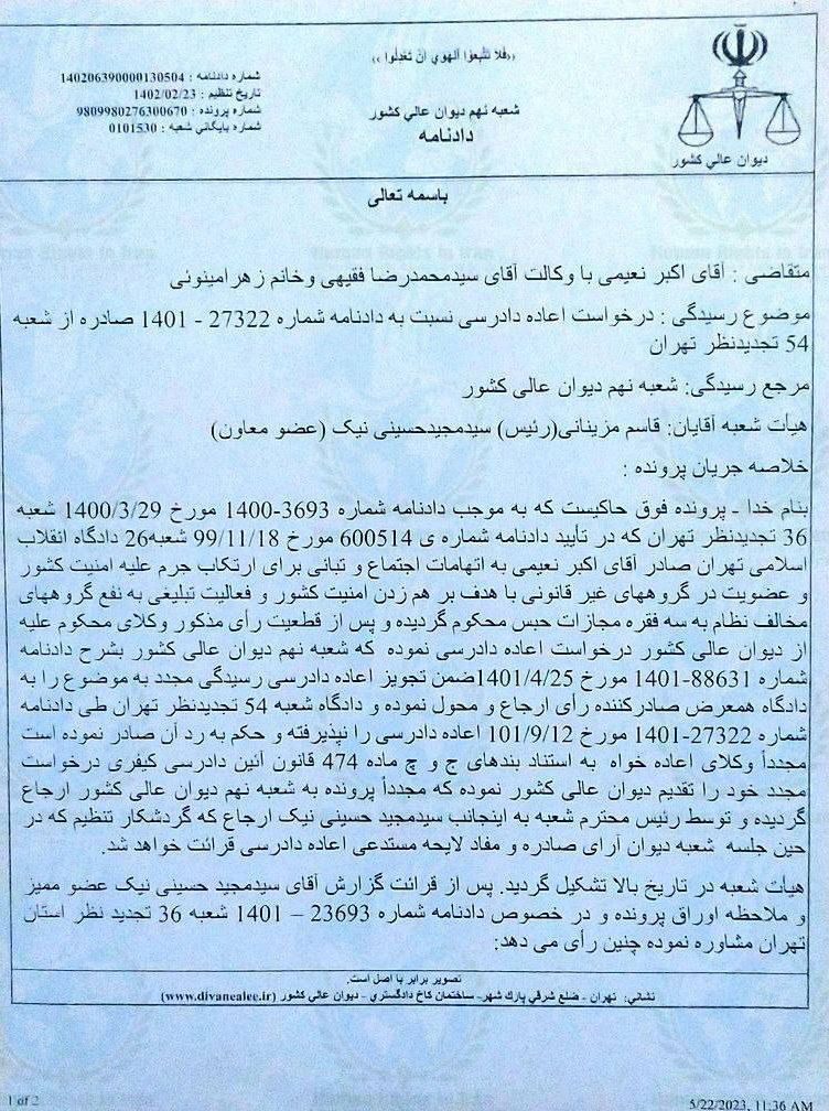 به نقل از یک منبع مطلع از روند حقوقی پرونده اکبر نعیمی در گفتگو با گزارشگر حقوق بشر در ایران:”در دادنامه ای که روز ۲۳ اردیبهشت ماه ۱۴۰۲ صادر و اخیرا به آقای نعیمی ابلاغ شده، قضات دیوان عالی کشور، مستندات و دفاعیات ارائه شده از طرف این فعال ملی مدنی را رد کرده و با استناد به ماده ۴۸۲ آئین دادرسی کیفری، قاضات شعبه ۹ دیوان عالی کشور اعلام کردند(نسبت به حکمی که پس از اعاده دادرسی صادر میشود دیگر اعاده دادرسی از همان جهت پذیرفته نمیشود) و پرونده او با توجه به اینکه در راستای بخشنامه قوه قضائیه در بهمن ماه سال گذشته آزاد شده مختومه است.”