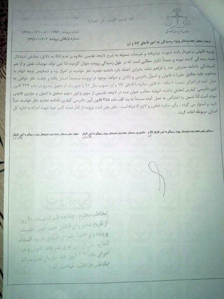 در طی یکسال گذشته نیز کلیه فاکتورهای خرید از شرکتهای داخلی کشور به دادگاه مربوطه ارائه شده بود، با این حال بعد از حدود یکسال نیم از پلمب محل کسب بخاطر وجود حدود ۸۵۰ عدد فریم عینک (کل دارایی و موجودی مغازه) که فاکتورهای خرید داخلی نیز ارائه شده بود و حتی ایشان وارد کننده نبوده اند و همینطور برخلاف ماده ۶۲ در بند ج که اشاره شده اگر مسئول واحد صنفی در طول یکسال ۳ بار مرتکب تخلف شود فقط در مرحله سوم آن هم بعد از اثبات در دادگاه صالحه و فقط به مدت ۶ ماه محل کسب پلمب میشود، متاسفانه وی در دادگاه به صورت ناعادلانه ای به پرداخت مبلغ ۵۰ میلیون تومان جریمه محکوم شد که این حکم پس از تایید شعبه تجدید نظر در دادگاه تعزیرات حکومتی استان البرز قطعیت یافت.
