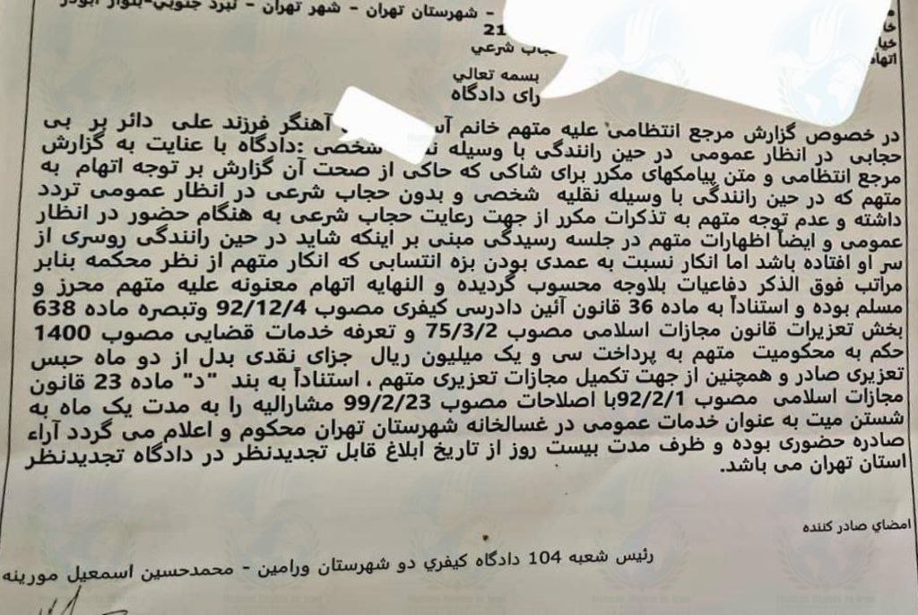 براساس این گزارش، اتهام منتسب شده به این شهروند (کشف حجاب در انزار عمومی و عدم رعایت حجاب شرعی در هنگام رانندگی) عنوان و برهمین اساس خانم آهنگر به مدت ۱ ماه باید در یکی از غسالخانه های تهران به کار شستشوی میت اقدام و همچنین مبلغ ۳۱ میلیون ریال را به عنوان جزای نقدی پرداخت کند.