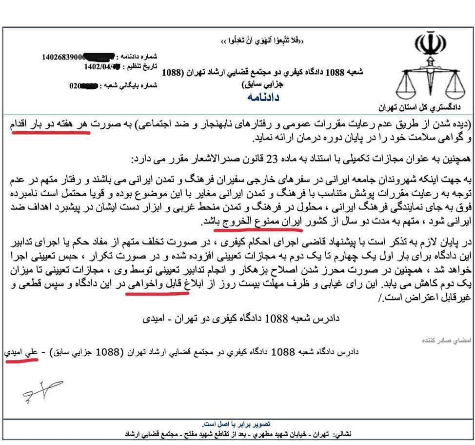 براساس دادنامه صادره توسط شعبه ۱۰۸۸ دادگاه کیفری ۲ تهران که در تیر ماه سال جاری به متهم این پرونده ابلاغ شده؛ متهم این پرونده از بابت اتهام (عدم رعایت حجاب شرعی در معابر و انظار عمومی) به تحمل ۲ ماه حبس تعزیری، دو سال منع خروج از کشور محکوم شده است.