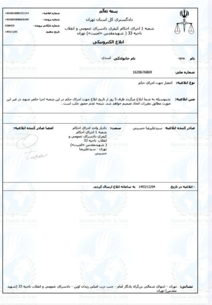 براساس ابلاغیه صادره مقرر شده تا ودود اسدی، از تاریخ ۱ اسفند ماه ۱۴۰۳، تا ۵ روز خود را برای سپری اجرای حکم قطعی به شعبه اول اجرای احکام دادسرای ناحیه ۳۳ تهران، معرفی کند.