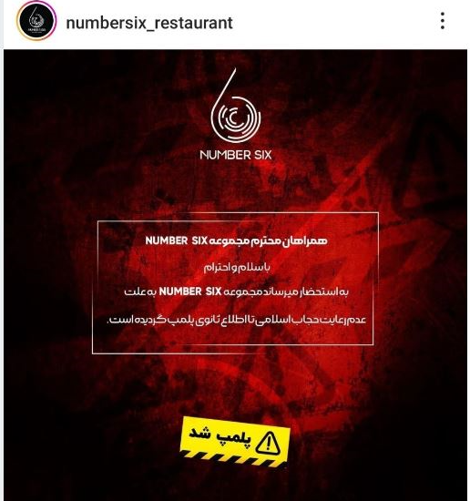 براساس متن منتشر شده در صفحه اینستاگرام متعلق به کافه رستوران نامیر سیکس:”رستوران Number Six به علت (عدم رعایت حجاب اسلامی) تا اطلاع ثانوی پلمب شده است.”