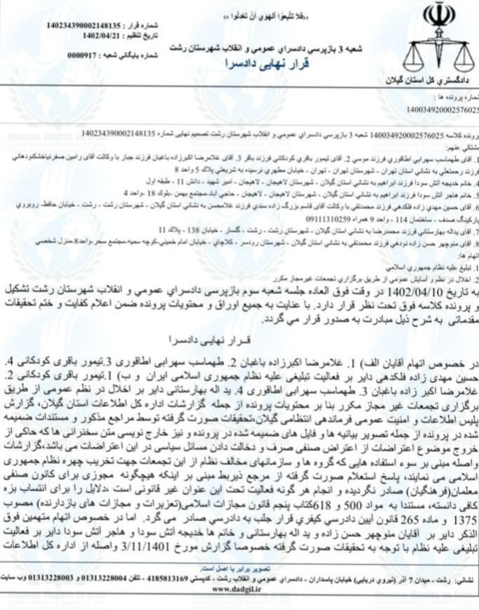 به گزارش حقوق بشر در ایران به نقل از شورای هماهنگی تشکلهای صنفی فرهنگیان کشور، روز چهارشنبه ۲۱ تیر ماه ۱۴۰۲، تیمور باقری کودکانی، غلامرضا اکبرزاده باغبان، طهماسب سهرابی و حسین مهدی زاده، فعالان صنفی فرهنگیان ساکن شهر رشت مرکز استان گیلان پس از حضور در جلسه بازپرسی که توسط حامد خوشقدم، بازپرس شعبه ۳ دادسرای عمومی و انقلاب برگزار شده بود تفهیم اتهام و کیفرخواست این شهروندان به دادگاه ارجاع شد.