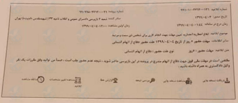 حقوق بشر در ایران – امروز پنجشنبه ۵ تیر ماه ۱۳۹۹, شعبه ۲ بازپرسی دادسرای امنیت تهران با صدور و ابلاغ احضاریه ای اکرم رحیم پور, همسر جعفر عظیم زاده را برای حضور در جلسه بازپرسی فراخواند.
