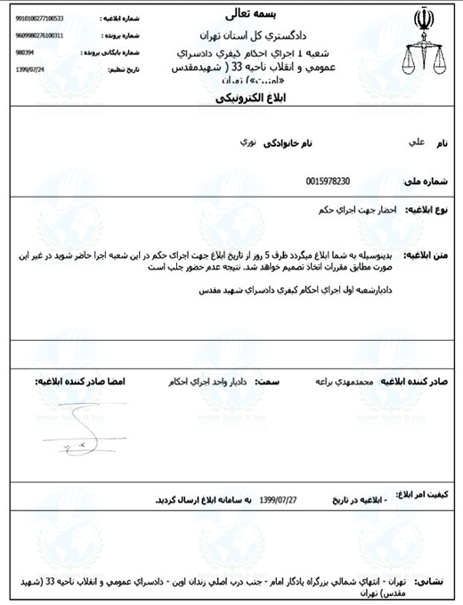 حقوق بشر در ایران – امروز چهارشنبه ۳۰مهر ماه ۱۳۹۹، شعبه ۱ اجرای احکام کیفری دادسرای زندان اوین با ارسال ابلاغیه ای، علی نوری را برای تحمل حبس فراخواند.