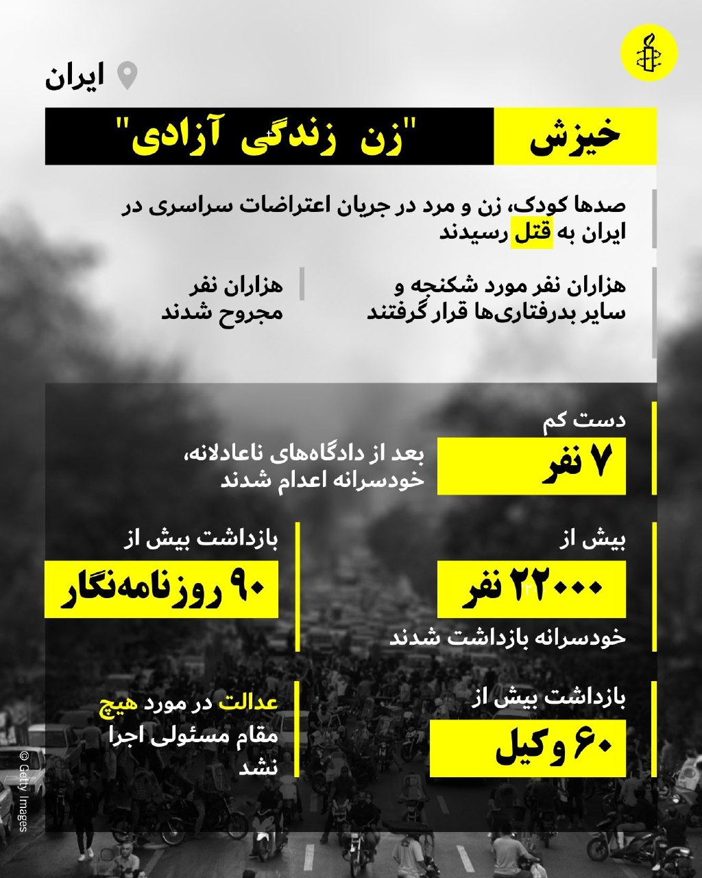“در حالی که در ایران نخستین سالگرد خیزش «زن، زندگی، آزادی» را گرامی میدارند، عفو بینالملل امروز اعلام کرد که جامعه جهانی باید راههایی را برای اجرای عدالت در سطح بینالمللی دنبال کند تا به مساله سیستماتیک مصونیت از مجازات مقامات جمهوری اسلامی که مسئول صدها مورد قتل معترضان و اعمال شکنجه گسترده هستند، رسیدگی کند.