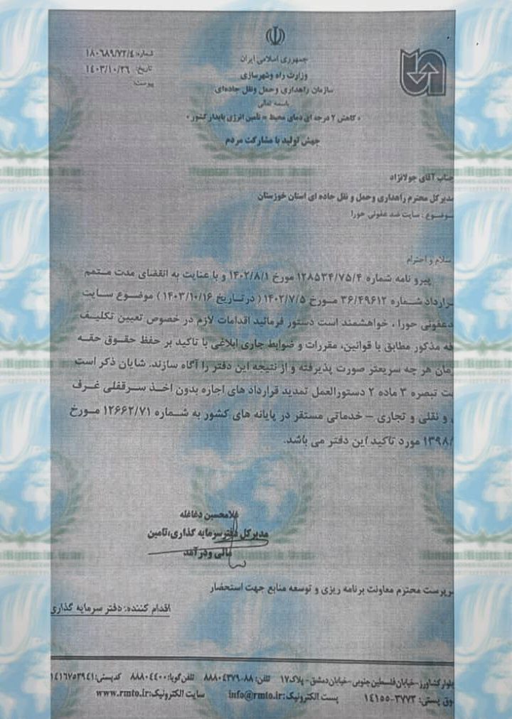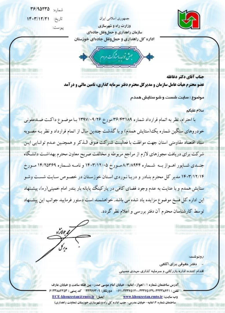در پایانه بار «بندر امام خمینی»، سایتهای ضدعفونی و کارواشها بهنام “سایت ستایش همدم” و “سایت حورا” نهتنها هیچ توجیه فنی نداشتهاند بلکه موجب کاهش شدید ظرفیت پارکینگها و افزایش تصادفات شدهاند. این در حالی است که براساس نامههای رسمی منتشر شده از سوی وزارت راه و شهرسازی، این سایتها فاقد مجوز معتبر بودهاند و استفاده از فضای عمومی برای آنها برخلاف آییننامههای ملی و قوانین حملونقل جادهای صورت گرفته است.