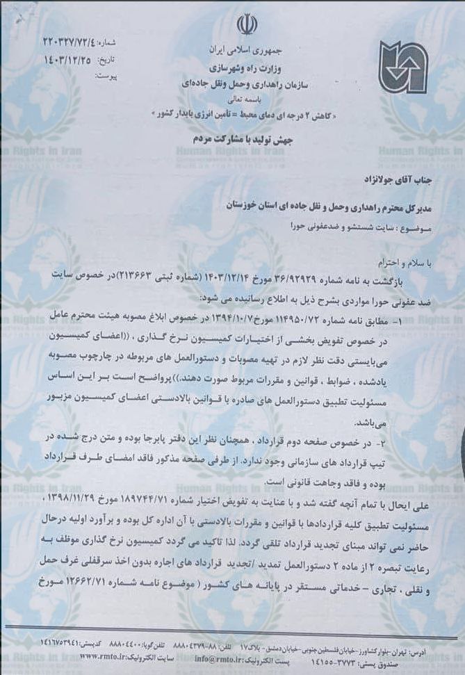 حقوق بشر در ایران ـ امروز یکشنبه ۲۱ اردیبهشت ماه ۱۴۰۴، در سایه خلأ نظارتی، ساختار فاسد و روابط پشتپرده، سازمان راهداری و حملونقل جادهای به یکی از نمادهای فساد ساختاری در جمهوری اسلامی ایران بدل شده است. از نابودی اراضی کشاورزی گیلان تا تخریب پایانه بار بندر امام، پشت پرده این پروژهها زنجیرهای از رانت، تبانی، و حمایت سیاسی گسترده نهفته است.