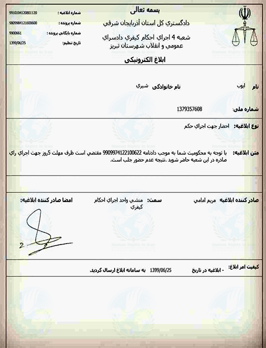 حقوق بشر در ایران – امروز جمعه ۲۸ شهریور ماه ۱۳۹۹، شعبه ۴ اجرای احکام کیفری تبریز با ارسال ابلاغیه ای کتبی، ایوب شیری، فعال ملی مدنی ساکن این شهرستان را برای اجرای حکم دادگاه در مجازات تکمیلی فراخواند.