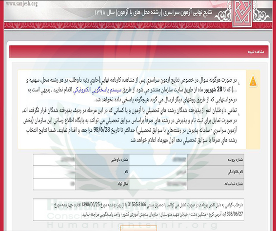 با توجه به اسامی اعلام شده و از سوی دیگر پیگیریهای این شهروند بهائی برای علت نقص در پرونده پس از مراجعه به واحد پاسخگویی سازمان سنجش و آموزش کشور از جملگی این افراد پیرامون اعتقاد به دیانت بهائی در غالب فرمهایی تفتیش عقیده بعمل آمده است.
