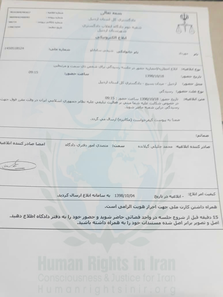 به گزارش حقوق بشر در ایران, روز چهارشنبه ساعت ۹:۳۰ دقیقه صبح روز چهارشنبه ۱۸ دی ماه ۱۳۹۸, مهرداد شیخی, شهروند ساکن استان اردبیل و از بازداشت شدگان تجمعات اعتراضی آبان ماه سالجاری از بابت اتهام “فعالیت تبلیغی علیه نظام”, توسط شعبه ۲ دادگاه انقلاب اردبیل برگزار شد و این شهروند پس از ارائه دفاعیات خود در جلسه دادرسی و اتمام جلسه تا به امروز شنبه به منزل مراجعه نکرده و احتمال بازداشت وی دور از ذهن نیست. مهرداد شیخی در جریان تجمعات آبان ماه سالجاری در پی یورش ماموران امنیتی به منزل پدری وی بازداشت شده بود و پس از ۱۱ روز با تودیع قرار وثیقه و بطور موقت آزاد شده بود.