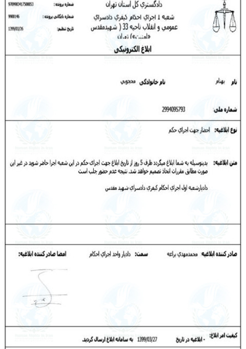 حقوق بشر در ایران – امروز سه شنبه ۲۷ خرداد ماه ۱۳۹۹, شعبه ۱ اجرای احکام کیفری دادسرای امنیت تهران به ریاست قاضی محمدمهدی براعه با صدور احضاریه ای بهنام نظام آبادی « محجوبی », درویش گنابادی ساکن کرمان و از بازداشت شدگان حادثه گلستان هفتم پاسداران را برای اجرای حکم ۲ سال حبس تعزیری فراخواند.