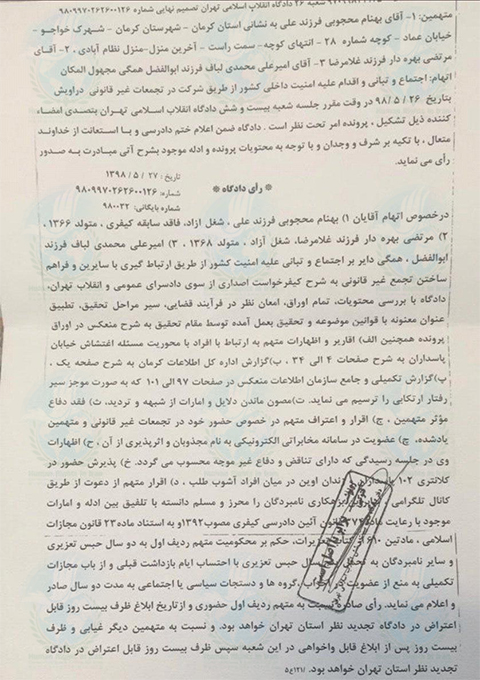 این درویش گنابادی, در تاریخ۲۷ مرداد ماه ۱۳۹۸, توسط شعبه ۲۶ دادگاه انقلاب تهران به ریاست ایمان افشاری از بابت اتهام “اجتماع و تبانی علیه امنیت کشور از طریق ارتباط گیری با سایرین و فراهم ساختن تجمع غیر قانونی در مقابل کلانتری ۱۰۲ خیابان پاسداران تهران و عضویت ارتباط با فعالان رسانه ای دراویش گنابادی و حضور در تجمع اعتراضی دراویش در مقابل زندان اوین بر طبق ماده ۳۷۴ از قانون آئین دادرسی کیفری و استناد به ماده ۲۳ قانون مجازات اسلامی به تحمل ۲ سال حبس تعزیری و بعنوان مجازات تکمیلی هم به ۲سال محرومیت از عضویت در احزاب و گروهها و دسته جات سیاسی و اجتماعی, محکوم شده بود. این حکم پس از ارجاع پرونده به دادگاه تجدیدنظر عیناً تائید شد.