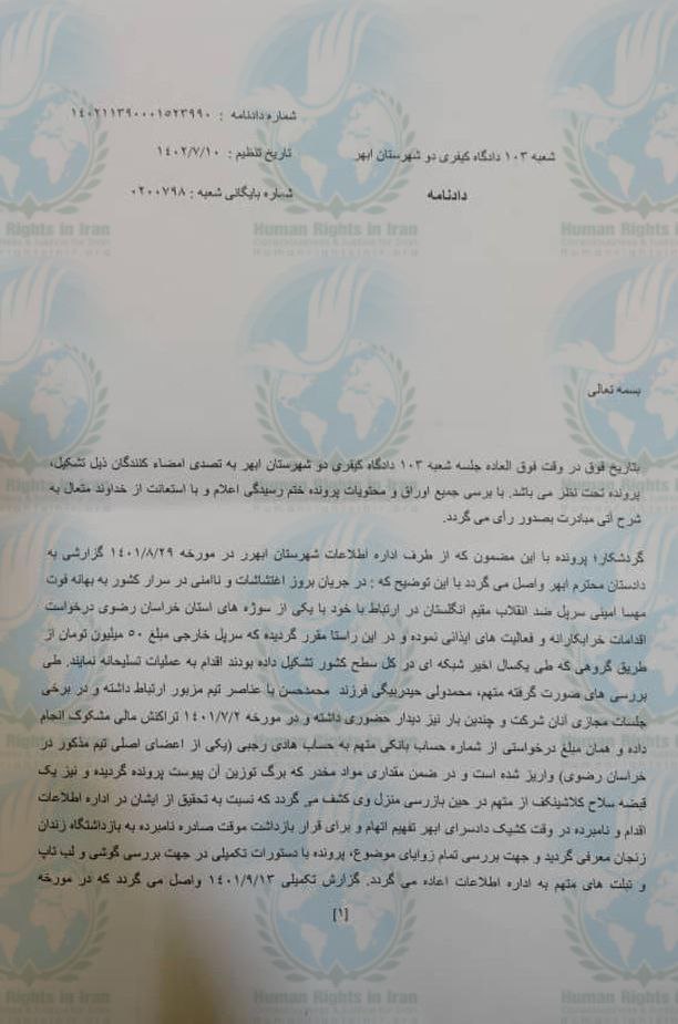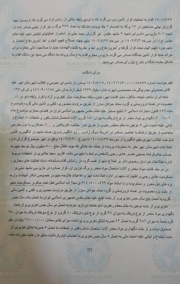 حقوق بشر در ایران ـ امروز پنجشنبه ۱۳ مهر ماه ۱۴۰۲، محمدولی حیدربیگی، توسط قاضی و دادرس شعبه ۱۰۳ دادگاه کیفری۲ ابهر، به حبس تعزیری محکوم شد.