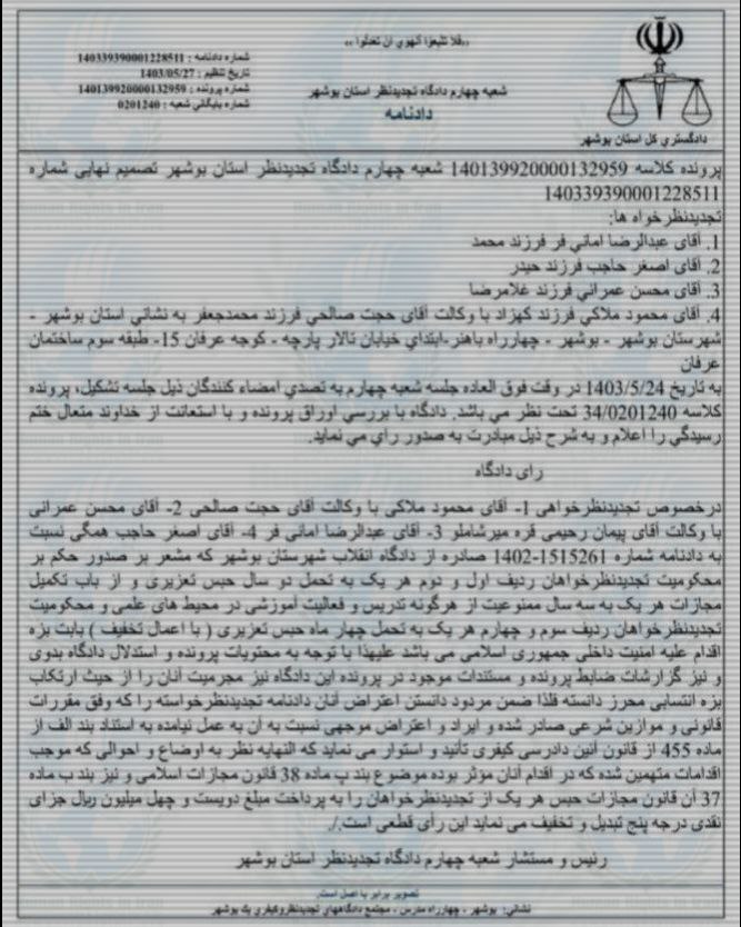 براساس دادنامه صادر شده در تاریخ ۲۷ مرداد ماه ۱۴۰۳، هر یک از این ۴ فعال صنفی فرهنگیان، از بابت اتهامات «اقدام علیه امنیت از طریق فعالیت در تشکل کانون صنفی معلمان استان بوشهر» و «اخلال در نظم و آسایش عمومی از طریق برگزاری تجمع اعتراضی غیرقانونی» به پرداخت ۲۴۰ میلیون ریال جریمه نقدی درجه ۵ محکوم شدند.