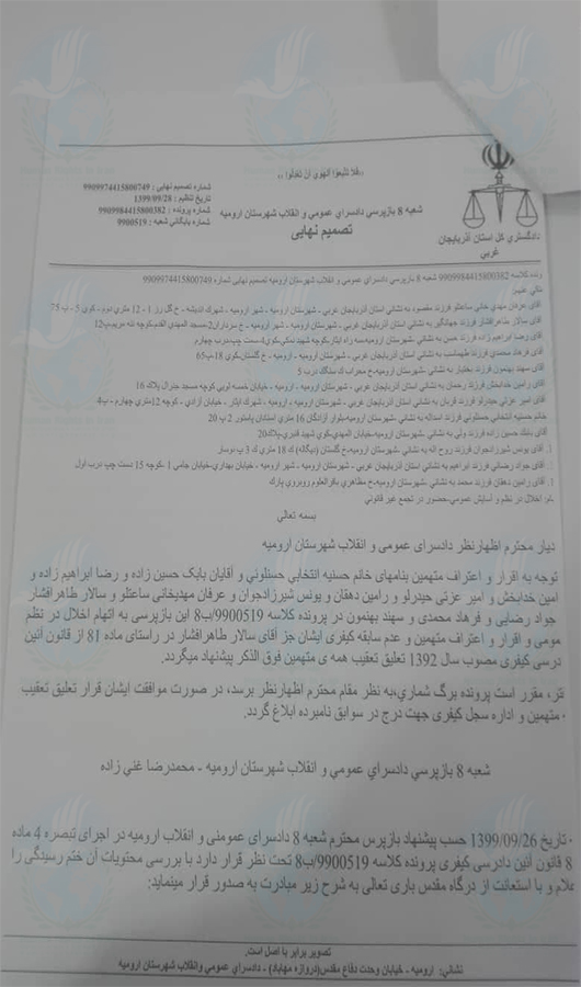 لازم به ذکر است، جله بازپرسی جملگی این ۱۰ فعال ملی مدنی در تاریخ ۲ آذر ماه ۱۳۹۹، توسط شعبه ۸ بازپرسی دادسرای عمومی و انقلاب شهرستان ارومیه برگزار و این شهروندان پس از اتمام جلسه بازپرسی در انتظار اعلام تاریخ دادرسی از سوی شعبه دادگاه انقلاب این شهرستان بودند.