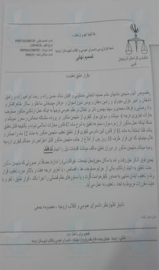 به گزارش حقوق بشر در ایران، امروز چهارشنبه ۳ دی ماه ۱۳۹۹، رسیدگی به پرونده قضائی حسنیه انتخابی حسنلویی، عرفان مهدی خانی ساعتلو، سالار طاهر افشار، رضا ابراهیم زاده، بابک حسین زاده ، رامین دابخش، امیر عزتی حیدرلو، رامین دهقان، یونس شیرزاد جوان، جواد رضایی، فرهاد محمدی و سهند بهنمون، دوازده تن از فعالان ملی مدنی بازداشت شده در جریان اعتراضات شهرستان ارومیه توسط شعبه ۸ بازپرسی دادسرای عمومی و انقلاب ارومیه به ریاست محمدرضا غنی زاده، به مدت ۱۰ ماه تعلیق شد.