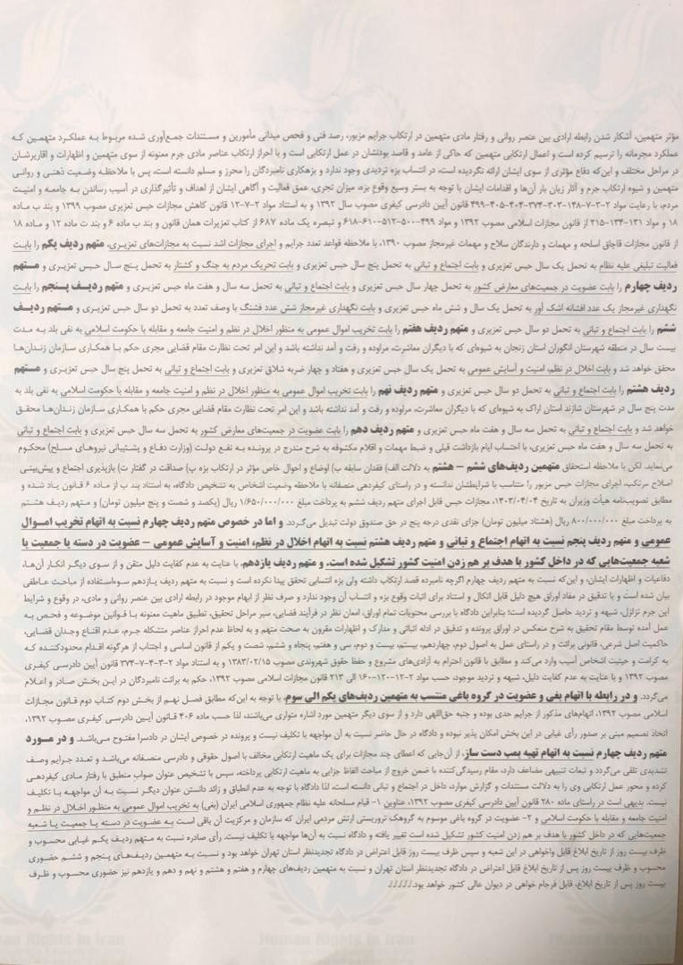 به گزارش حقوق بشر در ایران، روز یکشنبه ۲۵ شهریور ماه ۱۴۰۳، شاهین زحمت کش، امین سخنور، علی هراتی مختاری، حسین محمدحسینی، نسیم غلامی سیمیاری، سیدامیر شاه ولایتی، حمیدرضا سهل آبادی و احسان روازژیان، متهمان ردیف ۱ تا ۱۱ یک پرونده سیاسی، توسط قاضی ایمان افشاری ـ رئیس شعبه ۲۶دادگاه انقلاب تهران، در مجموع به ۶۵ سال و ۸ ماه حبس تعزیری، ۲۵ سال نفی بلد، پرداخت جریمه نقدی، تحمل تبعید و مجازات تکمیلی محکوم شدند. همچنین، فرید گلشنی و سیامک تدین، متهمان ردیف ۲ و ۳ این پرونده با توجه به اینکه پیش از دستگیری از کشور خارج شدند دادگاه برای آین افراد پرونده را باز نگه داشته است. از سوی دیگر، حسین اردستانی، متهم ردیف ۱۱ این پرونده از اتهامات منتسبه تبرئه شد.
