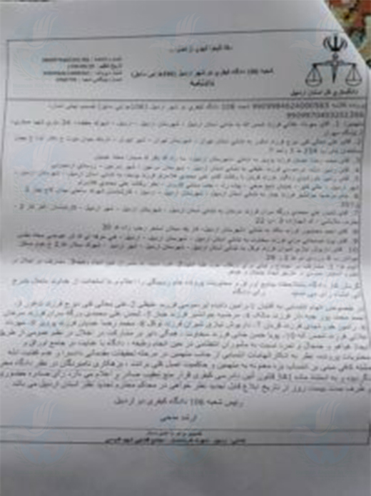 براساس دادنامه صادره توسط شعبه ۱۰۶ دادگاه کیفری ۲ شهرستان اردبیل که در تاریخ ۲۹ آذر ماه ۱۳۹۹ صادر و طی روزهای اخیر به جملگی متهم این پرونده ابلاغ شد اتهامات مطروحه بر علیه این شهروندان «مشارکت در اجتماع و تبانی برای ارتکاب جرم علیه امنیت » « مشارکت در اخلال در نظم عمومی از طریق ایجاد هیاهو و جنجال » و « تمرّد به مأموران انتظامی در حین انجام وظیفه » عنوان شده و قاضی دادگاه با استناد به ماده ۳۴۱ قانون آئین دادرسی کیفری قرار منع تعقیب جملگی این افراد را صادر کرده است.