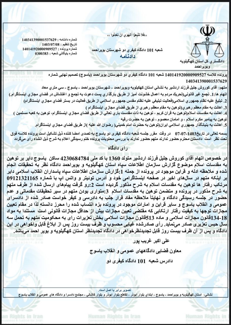 به گزارش حقوق بشر در ایران، روز یکشنبه ۸ مهر ماه ۱۴۰۳، کوروش جلیل، فرزند: اردشیر، اهل و ساکن یاسوج مرکز استان کهگیلویه و بویراحمد، توسط قاضی علی اکبر غریب پور ـ رئیس شعبه ۱۰۱ دادگاه کیفری ۲ استان کهگیلویه و بویراحمد، به تحمل ۳ سال حبس تعزیری، محکوم شد. این فعال مدنی، در تاریخ ۱ آبان ماه ۱۴۰۳، با دریافت ابلاغیه ای کتبی، برای محاکمه در پرونده ای دیگر، به شعبه دادگاه انقلاب استان کهگیلویه و بویراحمد احضار شده است.