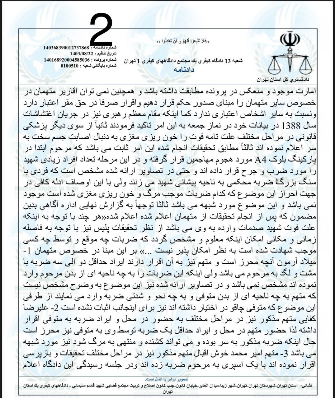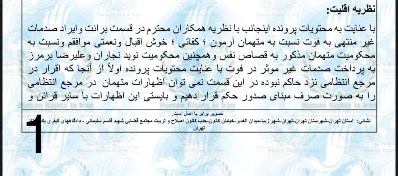 همچنین، با توجه به دادنامه«بعنوان رای اقلیت» صادره توسط اصغر خلیلی، رئیس شعبه ۱۳ دادگاه کیفری ۱ استان تهران:”حسین نعمتی، نوید نجاران و علیرضا برمرز پوربرناک، در پی اعمال ماده ۱۲۰ قانون مجازات اسلامی و ماده ۴ قانون آئین دادرسی کیفری، حکم بر برائت این افراد صادر شده است.”