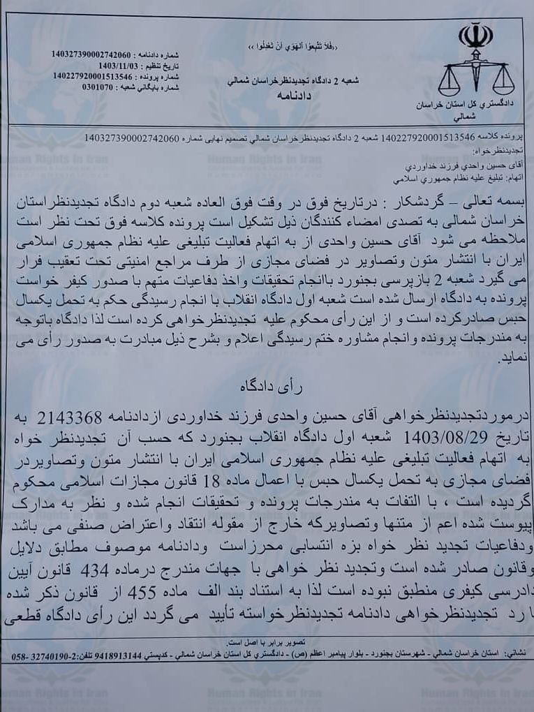 همچنین، جلسه دادرسی به بخش دوم اتهام حسین واحدی در همین پرونده قضایی، از بابت اتهامات«تبلیغ علیه نظام» در تاریخ ۸ آذر ماه ۱۴۰۲، توسط قاضی شعبه اول دادگاه انقلاب بجنورد برگزار شده بود.