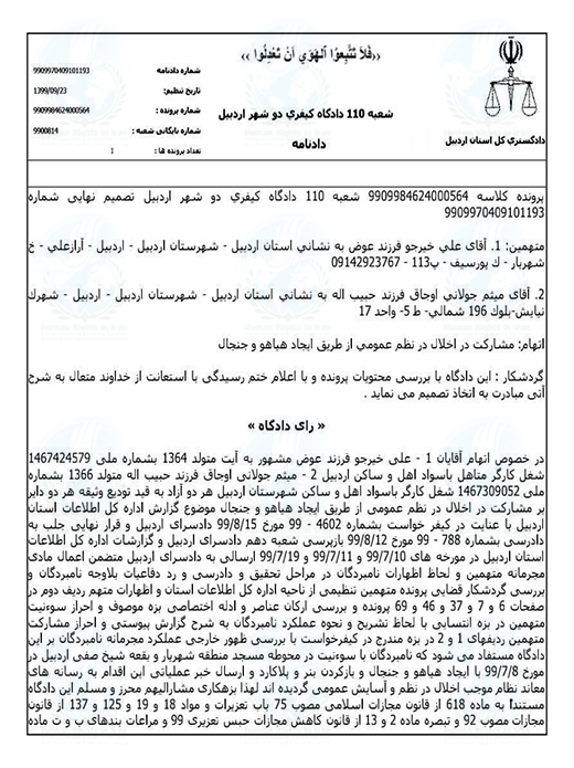 حقوق بشر در ایران – امروز دوشنبه ۲۲ دی ماه۱۳۹۹، شعبه ۱۱۰ دادگاه کیفری ۲ اردبیل، به ریاست قاضی سجاد حبیبی، با صدور دادنامه ای میثم جولانی و علی خیرجو، دو تن از فعالان ملی مدنی ساکن این استان را به تحمل حبس تعزیری و شلاق محکوم کرد.