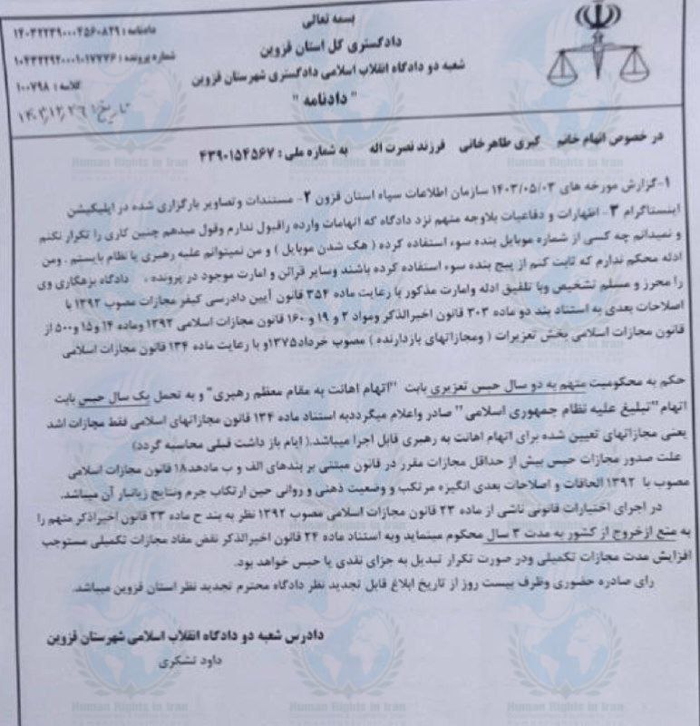 براساس دادنامه صادره توسط قاضی شعبه دادگاه انقلاب قزوین؛ کبری طاهرخانی، از بابت اتهام ««توهین به رهبری» به تحمل ۱ سال حبس تعزیری و به اتهام «تبلیغ علیه نظام» هم به تحمل ۲ سال حبس تعزیری قابل تبدیل به مجازات تکمیلی و یا پرداخت جریمه نقدی، محکوم شده است.