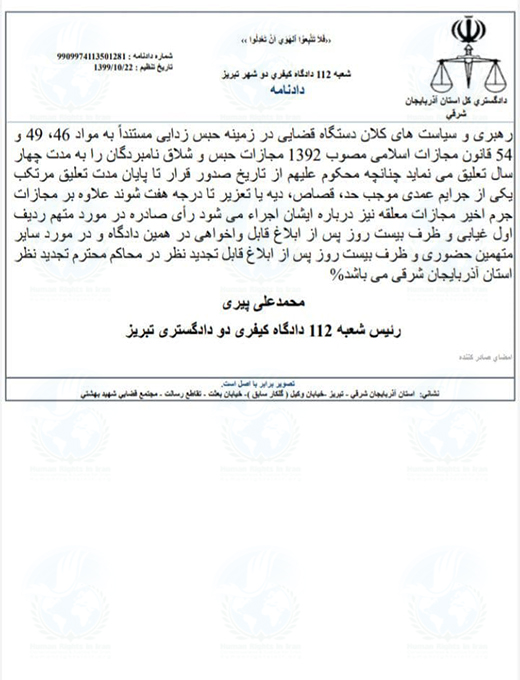 براساس این گزارش، حکم صادره توسط شعبه ۱۱۲ دادگاه کیفری ۲ تبریز با توجه به گزارش پلیس امنیت استان آذربایجان شرقی و سازمان اطلاعات سپاه در این استان که بعنوان ضابط پرونده این فعالان مدنی هستند پی از تنظیم کیفر خواست در شعبه بازپرسی دادسرای عمومی و انقلاب تبریز صادر و از طریق سامانه ثنا به متهمان این پرونده ابلاغ شد.