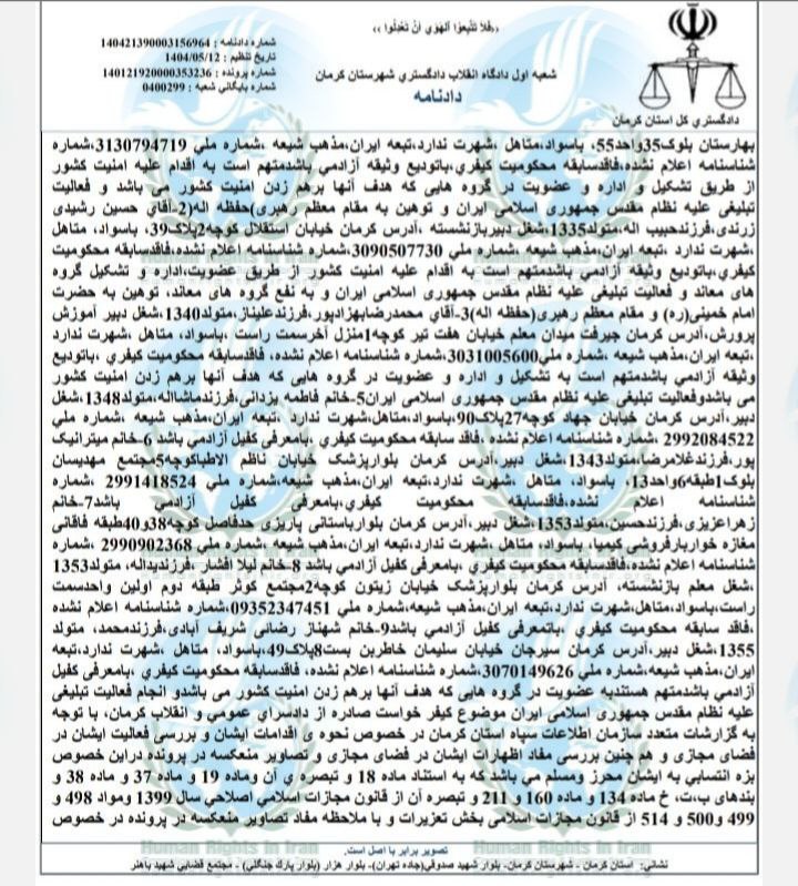 به گزارش حقوق بشر در ایران، روز یکشنبه ۱۲ مرداد ماه ۱۴۰۴، محمدرضا بهزادپور ـ فرزند: علیناز ـ متولد: ۱۳۴۰، زهرا عزیزی ـ فرزند: حسین – متولد: ۱۳۵۳، مجید نادری ـ فرزند: قنبرعلی ـ متولد: ۱۳۳۷، میترا نیک پور ـ فرزند: غلامرضا ـ متولد: ۱۳۴۳، فاطمه یزدانی ـ فرزند: ماشالله ـ متولد: ۱۳۴۸، محمد مستعلی زاده ـ فرزند: علی جان، شهناز رضایی شریف آبادی ـ فرزند: محمد ـ متولد: ۱۳۵۵، لیلا افشار ـ فرزند: یدالله ـ متولد: ۱۳۵۳ و حسین رشیدی زرندی ـ فرزند: حبیب الله ـ متولد: ۱۳۳۵، جملگی افراد از فعالان صنفی فرهنگیان، ساکن استان کرمان، توسط قاضی هادی آقایی پور ـ رئیس شعبه اول دادگاه انقلاب استان کرمان، در مجموع به تحمل ۸ سال حبس تعزیری، محکوم شدند. همچنین، بخشی از اتهام محمد مستعلی زاده، برای انجام تحقیقات تکمیلی به دادسرا عودت داده شد.